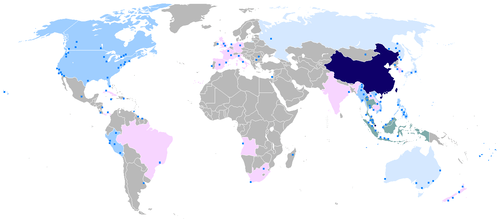 Until the late 20th century, Chinese emigrants to Southeast Asia and North America came from southeast coastal areas, where Min, Hakka, and Yue dialects are spoken.[43] The vast majority of Chinese immigrants to North America spoke the Taishan dialect, from a small coastal area southwest of Guangzhou.[44]