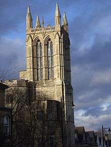 Christ Church is Grade II listed building[7] standing in a prominent position on the west side of Gipsy Hill immediately north of its junction with Highland Road. The church that was consecrated in 1867 was designed by John Giles of Giles, Gough and Trollope. A large ragstone edifice with slated roofs, it consisted of a nave, aisles and a short apsidal chancel. Only 40 feet of the tower were included at that stage. Further building work in 1889 completed the tower and added a vestry and porch.[8] The building was listed as of special architectural or historic interest in 1981 and the description on the English Heritage website relates to its condition at that time.[9]