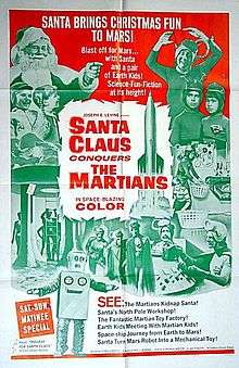 In Jacobson's film, Martians kidnap Santa Claus in a plan to bring fun to their listless, TV-obsessed children. Once on Mars, Santa mass-produces toys using a computerized machine, foils a sourpuss saboteur, and generates fun for all. Santa Claus Conquers the Martians has been novelized, adapted to musical stagings, and has taken its place as a holiday cult classic.[47] Child actress Pia Zadora played one of the Martian children and years later commented, "It was very well done, considering it was shot twenty years ago - gimme a break - and really is very entertaining. It's become a Christmas classic, really."[48]