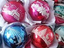 Max Eckhardt's Shiny Brite company manufactured colorful glass ornaments in a variety of sizes and shapes through the era. Packed in boxes by the dozen or half dozen, glimpses of the ornaments could be caught through the cellophane windows of the boxes' covers. The reds and greens of the past were supplemented with turquoise, chartreuse, orange, purple, and other vibrant colors.[1]