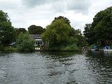 This inhabited islet connects by a footbridge to Church Street, Staines, adjoining The Lammas recreation ground and mini-golf course and 100m below the oldest of the town's three Anglican churches, a Grade II* medieval structure.[1] St. Mary's Church is on a small rise, elevated 5 metres above river level, and 21 metres above sea level, as such, from its steeple the island is visible. The island is 100m long and almost triangular, and rises no more than 1 metre above river level.[2] The narrow channel between the island and north bank (backwater) forms a small oxbow away from the course of the river.