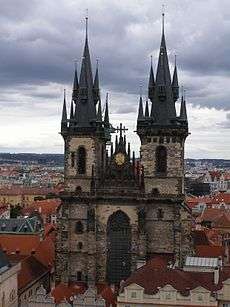 The Church of Mother of God before Týn (in Czech Kostel Matky Boží před Týnem, also Týnský chrám (Týn Church) or just Týn), often translated as Church of Our Lady before Týn, is a dominant feature of the Old Town of Prague, Czech Republic, and has been the main church of this part of the city since the 14th century. The church's towers are 80 m high and topped by four small spires.