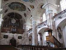 Saint Maurice served as the abbey church of a now defunct Benedictine monastery, originally founded in the 7th century and belonging to the oldest in Alsace.[3] The relatively plain exterior of the building, construction of which was started in the late 17th century to replace a much older predecessor, is related in its rectangular floor plan to a medieval form of architectural language and indicates nothing of the richness of the interior design and furnishing. These are largely the work of Tyrolean artists: the ceiling paintings (1730–1733), with depictions of the legends of Maurice and of Benedict are by Josef Mattes (nave) and Joseph Mages (chorus, transept, crossing); the choir and confessionals were also made by Tyrolians. Some Alsatians and Germans were however involved in the design of the bright and colorful interior: The expressive Samson pulpit (see also St. George's Church, Sélestat) is a work by Clemens Winterhalder and the mighty main altar (1728) one by Jean-Léonard Meyer from Sélestat The other altars are works by Anton von Wihl, from Sélestat, and Anton Ketterer, from Colmar.