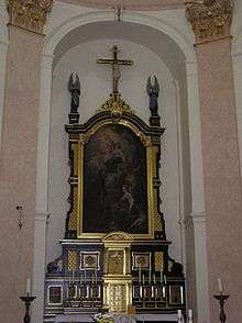 The main Neo-Renaissance altar is the work of Antonin Baum and dates to 1879, when the church interior was restored and modified. In its center is a picture of an earlier period, the work of Ignác Raab in 1760, divided into two zones. At the top is the Virgin Mary as the Queen of Heaven with angels and at the bottom are patron saints invoked against plague epidemics: St. Roch, St. Sebastian, and St. Rosalia. The background of the image depicts the horror and destruction caused by the plague.