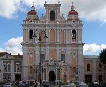 Church of St. Casimir (Lithuanian: Šv. Kazimiero bažnyčia, Polish: Kościół Św. Kazimierza) is a Roman Catholic church in Vilnius' Old Town, close to the Vilnius' Town Hall. It is the first and the oldest baroque church in Vilnius, built in 1618.[1] The construction of the church began in 1604 in memory of the holy prince Saint Casimir: it was built by the Jesuits with funding by the Great Chancellor of the Grand Duchy of Lithuania Lew Sapieha. It is traditionally assumed that the corner stone (which can be seen on the façade wall) was pulled into the city by procession of 700 Vilniusites from the Antakalnis hills. The construction was finished in 1616, and the interior design completed in 1618. The Church of St. Casimir is one of the earliest exemplary Baroque buildings in the city, designed along the line of the famous Il Gesù church in Rome (Church of the Gesù). It was apparently designed by Povilas Bokša, and the construction was supervised by Jan Frankiewicz, a pupil of architect Giovanni Maria Bernardoni. In the middle of the 18th century the church was reconstructed by architect Tomas Žebrauskas. Under his supervision a stepped lantern cupola with a crown was erected. This large and impressive cupola is unique in the entire region of the former Grand Duchy of Lithuania. Under Russia's occupation the church of St. Casimir was converted into a Russian Orthodox church. In 1915 Vilnius was occupied by the Germans and the church was converted into the Evangelical Lutheran prayer house of the Vilnius Garrison. In 1919 the church of St. Casimir was returned to the Catholics, but was damaged again during the Second World War, closed down and in 1963 converted into a Museum of Atheism. The church was reconsecrated in 1991.