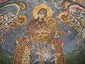 The conch of the apse is framed by ornaments and an inscription, showing in its centre the enthroned Mary with the Christ Child on her lap, flanked by Michael and Gabriel. Below are eight church fathers walking towards the newborn Christ, who is lying on an altar for his ritual sacrifice. This image is shown here for the first time in byzantine art and therefore contributing to the development of the variety of scenes. The theme came up because of the since the second half of the 11th century existing discussion in Constantinople about the eucharistical sacrifice and is portrayed again and again until the Middle Ages. Some door lintels and window frames have a decoration reminding of marble. A similar presentation could have been used for the altar and the throne.