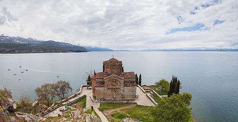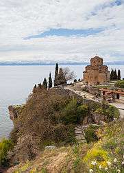 Saint John the Theologian, Kaneo (Macedonian: Свети Јован Канео, Latinic: Sveti Jovan Kaneo) or simply Saint John at Kaneo is a Macedonian Orthodox church situated on the cliff over Kaneo Beach overlooking Lake Ohrid in the city of Ohrid, Republic of Macedonia. The church is dedicated to John of Patmos, the writer of Revelation, who has been by some considered to be the same person as John the Apostle. The construction date of the church remains unknown but documents detailing the church property suggest that it was built before the year 1447. Archaeologists believe that the church was constructed some time before the rise of the Ottoman Empire very likely in the 13th century. Restoration work in 1964 led to the discovery of frescoes in its dome.