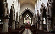 During the 12th Century the monastery was rebuilt as a church in stone and consisted of the nave, two side aisles and a chancel. The west door to the church stood where the tower now stands. The windows were set in gables and the lines of these gables and the rounded arches of the Norman windows in the south aisle are some of the oldest features still visible in today's building.[1]