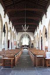 There is a pulpit dating from 1634 and is also a screen of the same age which shuts off the choir vestry.[1] The small font at the front of the church was given by Harry Bridges in 1725 and the three brass chandelier, which hang in the nave, by Mrs Ann Tilly in 1717.[14]