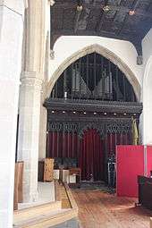 The first documentary evidence of a pipe organ in the church is from 1847 when a new instrument a 2-manual with 14 stops, by George Sherborne, was installed on the west gallery. In the 1860s it was moved to the east end of the south aisle and then, in 1880s enlarged and the console moved to the chancel with the pipes being positioned behind the screen. A clarinet was added in the 1920s and in 1939 an electric blower was added. In the 1960s a major restoration was undertaken with further work on the organ in 1986, 1991 and 2000.[15]