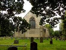 In the two-light window on the north side of the chancel, the left light features the Raising of Lazarus story (John 11:1–44). The text says "Lazarus come forth" (John 11.43) and "Jesus wept" (John 11.35). The second light illustrates the story of the Raising of the son of the widow of Nain (Luke 7:11–17) This window was dedicated to William Strother by his mother. The Strothers were major landowners in the village area, living locally at Low Hall, Kennel Hall Farm and Westfield.[15][23] The east window was made by Cox & Son.[24][25] The design of the central two lights is based on John 20:24–29, the story of Doubting Thomas. In this image, Thomas (shown kneeling at bottom of second light from left) has finally seen the Resurrection and checked the wounds, and he now believes in it. The top part of the window consists of three small rose lights, containing symbols. The left symbol is the Paschal Lamb, a heraldic symbol in which the Lamb of God carries the cross of St. George. The right-hand rose shows a pelican vulning, a heraldic symbol (a crest in this case) of a self-sacrificing pelican feeding her young with the blood from her breast, symbolising the Passion. This medieval symbol was superseded by the Lamb and Flag. The image in the uppermost rose shows the intertwined Alpha and Omega. Thomas Strother, who paid for this window, dedicated it to his wife or mother, and died while the church was in process of construction.[1][15][23] The two-light window on the north side of the chancel is dedicated to Thomas Strother (1806–1879) by his widow. The left-hand light represents St Peter, carrying the Keys of Heaven, with his book at his feet, symbolising the Scriptures. The angel below him carries the words, "Rejoice in the lord alway" (Paul's Epistle to the Philippians 4:4). The right hand light shows Paul the Apostle carrying a sword symbolising his martyrdom, with the Scriptures in the form of a book at his feet. The angel below him has the words "The just shall live by faith" (Paul's Epistle to the Romans 1:17).[15][23]