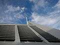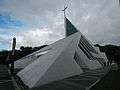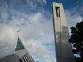 The Church of the Gesù is the Roman Catholic church of the Ateneo de Manila University campus in Quezon City in the Philippines. The landmark was designed by Jose Pedro Recio and Carmelo Casas. The edifice’s massive triangular structure symbolizes the Holy Trinity, as well as the three-fold mission and vision of the school. Its shape and design are also meant to suggest the outstretched arms of the Sacred Heart, and the traditional Filipino bahay kubo (nipa hut). The site has a total area of 10,200 square metres (110,000 sq ft) and seating capacity for 1,000 persons. The church is situated on Sacred Heart Hill, a small hill overlooking Bellarmine Field, believed to be the highest point in Loyola Heights. In its immediate vicinity are the dormitories (Cervini and Eliazo Halls) and the John Pollock Renewal Center. The peak cross and carillon (see below) of the church can be seen from Katipunan Avenue, which borders the campus to the west.