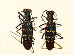 Head, pronotum and elytra are dark brown, with yellow marking on elytra. It has giant prominent compound eyes and large jaws.
