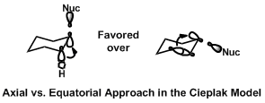 Cieplak also demonstrated this effect by introducing electron withdrawing substituents on C3, which decrease the electron-donating capability of the ring C-C bond and therefore disfavor equatorial attack, which is antiperiplanar to this bond.[5] Electron-donating substituents at C3 subsequently favor equatorial approach, since increasing C-C electron density favors σC-C donation into σ*C-Nuc and thereby encourages equatorial approach.