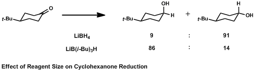 The Cieplak effect uses hyperconjugation to explain the face-selective addition of nucleophiles to carbonyl carbons. Specifically, donation into the low-lying σ*C-Nuc bond by antiperiplanar electron-donating substituents is the stabilizing interaction which lowers the transition state energy of one stereospecific reaction pathway and thus increases the rate of attack from one side. In the simplest model, a conformationally constrained cyclohexanone is reduced to the corresponding alcohol. Reducing agents add a hydride to the carbonyl carbon via attack along the Burgi-Dunitz angle, which can come from the top along a pseudo-axial trajectory or from below, along a pseudo-equatorial trajectory. It has long been known that large reducing agents add hydride to the equatorial position to avoid steric interactions with axial hydrogens on the ring. Small hydride sources, however, add hydride to an axial position for reasons which are still disputed.[3]