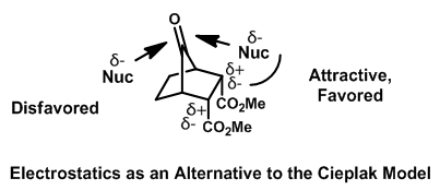 In the case of substituted norbornones, stereoselectivity may be explained by electrostatic interactions between substituents and nucleophiles. Electron-withdrawing groups create a partial positive charge on the alpha carbon, which interacts favorably with the partial negative charge on the incoming nucleophile.[19] This interaction may guide attack syn to the electron-withdrawing substituent, and anti to electron-donating substituents. This conclusion is supported by computations, where modeling the partial charges predicts product distribution without including orbital interactions.[20] The same explanation has been made to justify similar results in the case of substituted adamantones.[21]