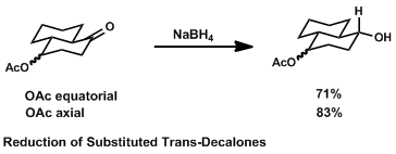 Similarly, in Houk’s trans-decalone system, the nucleophile with its partial negative charge prefers to attack away from the partial negative charge of the acyl ester. When this substituent is axial, the equatorial pathway brings the nucleophile into closer proximity and is therefore disfavored.[22] This is less pronounced for equatorially substituted ester because the group is now positioned further away from the carbonyl.[16]