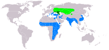 It breeds in southern parts of eastern Europe and central Asia (such as Iran) and winters mainly in India and southeast Asia. It is a very rare vagrant to Great Britain and western Europe, although remarkably a juvenile wintered in Norfolk in the winter of 2002/2003.