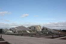 The City of Culture of Galicia (Galician: Cidade da Cultura de Galicia or simply Cidade da Cultura) is a complex of cultural buildings in Santiago de Compostela, A Coruña, Galicia, Spain, designed by a group of architects led by Peter Eisenman. Construction is challenging and expensive as the design of the buildings involves high degree contours, meant to make the buildings look like rolling hills. Nearly every window of the thousands that are part of the external façade has its own custom shape.[1] In 2013 it was announced that after more than a decade, construction of the project would be halted. The International Art Center and Music and Scenic Arts Center will not be built.[2]