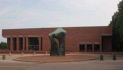 The Cleo Rogers Memorial Library, also known as the Main Library, is the flagship library of the Bartholomew County Public Library system. It includes a branch in Hope, Indiana, and a bookmobile that serves the county. The building was designed by I. M. Pei & Partners and constructed by Dunlap & Company, completed in 1969, and dedicated in 1971. It is notable for its design of red brick with concrete details and its Library Plaza, an urban space punctuated by the sculpture, "Large Arch" by Henry Moore. It is named for Cleo Rogers (1905-1964) who was the county librarian for 28 years and assistant librarian for nine years.