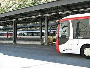 A regional bus service meets an interregional train service at Leuk (Switzerland) train station