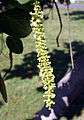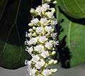 In late summer, it bears green fruit, about 2 cm (0.79 in) diameter, in large, grape-like clusters.[1] The fruit gradually ripens to a purplish color. Each contains a large pit that constitutes most of the volume of the fruit.