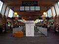 The station was designed by Charles Holden in a modern European style using brick, glass and reinforced concrete.[3] Compared with the other new stations Holden designed for the extension, Cockfosters' street buildings are modest in scale, lacking the mass of Oakwood or Arnos Grove or the avant-garde flourish of Southgate. Holden's early design sketches show the station with two towers.[4] The most striking feature of the station is the tall concrete and glass train shed roof and platform canopies which are supported by portal frames of narrow blade-like concrete columns and beams rising from the platforms and spanning across the tracks. The trainshed roof constructed at Uxbridge in 1937-38 was built to a similar design. Cockfosters station is a Grade II listed building.