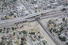 In December 2006, the Alameda Corridor Transit Authority (ACTA) presented a feasibility study to analyze alternatives and costs for design and construction of an east-west structure, which would grade separate the BNSF and UP main line tracks at Colton Crossing.[6] In addition, ACTA prepared a report on a proposed north-south flyover to the south of Colton Crossing to reduce train crossing conflicts and hours-long congestion. The report was evaluated by ACTA, UP, BNSF and the San Bernardino Associated Governments (SANBAG).[6] SANBAG conducted community outreach meetings to assist the project team with selecting the final build option.[7] In November 2011, work began on the grade separation project, with the final design being a 2.2-km east-west flyover of the Union Pacific tracks over the north-south BNSF tracks. Work was initially expected to take four years at a projected cost of $202 million.[5][8] Skanska was the lead contractor on this project.
