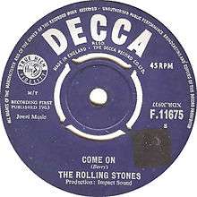 "Come On" was chosen as the Rolling Stones' debut single. Released in the late spring of 1963, it reached #21 on the UK single charts. The B-side was another cover version, Willie Dixon's "I Want to Be Loved". Both songs were recorded in May 1963. "Come On" has been released on several compilation albums: More Hot Rocks (Big Hits & Fazed Cookies) (1972), Singles Collection: The London Years (1989) (together with its B-side), Singles 1963-1965 (2004) (together with its B-side), Rolled Gold+: The Very Best of the Rolling Stones (2007) and GRRR! (2012).[1]