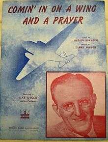 "Comin' in on a Wing and a Prayer" is a World War II song with words by Harold Adamson and music by Jimmy McHugh, published in 1943 by Robbins Music Corp.[1][2] The song was famously recorded by The Song Spinners for Decca Records, reaching No. 1 on the Billboard pop chart on July 2, 1943.[3] "Comin' in on a Wing and a Prayer" was the only song with a war connection to appear in the top twenty best-selling songs of 1943 in the United States.[4]