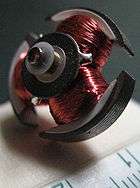 Various developments took place to automate the process of adjusting the commutation and minimizing the sparking at the brushes. One of these was the development of 'high resistance brushes', or brushes made from a mixture of copper powder and carbon.[3] Although described as high resistance brushes, the resistance of such a brush was of the order of milliohms, the exact value dependent on the size and function of the machine. Also, the high resistance brush was not constructed like a brush but in the form of a carbon block with a curved face to match the shape of the commutator.