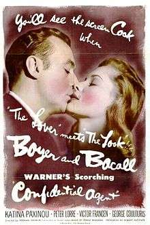 Confidential Agent is a 1945 spy film starring Charles Boyer and Lauren Bacall, and made by Warner Bros.[1][2] The movie was directed by Herman Shumlin and produced by Robert Buckner with Jack L. Warner as executive producer. The screenplay was by Robert Buckner, based on the novel The Confidential Agent by Graham Greene. The music score was by Franz Waxman and the cinematography by James Wong Howe. The supporting cast includes George Coulouris and Peter Lorre.