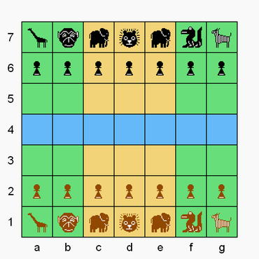 The starting setup is as shown. White (brown pieces in the diagram) moves first. Players alternate turns; there is no passing. The game is won by capturing the opponent's lion. The game immediately ends when a lion has been captured.