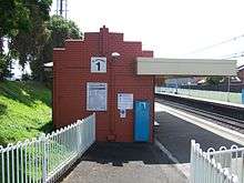 The new station included three single-storey buildings: a ticket office at street level on Gladstone Avenue, and two identical platform buildings containing a waiting room and toilets. The buildings were constructed in the functionalist style from dichromatic brick using iron oxide and clinker bricks with soldier courses. The platform buildings feature distinctive Art Deco style vertical 'fins' extending above the awnings at both ends. While all three buildings remain today, the exteriors have been painted over and the original internal fit-outs removed. The station is deemed to have local heritage significance.[7]