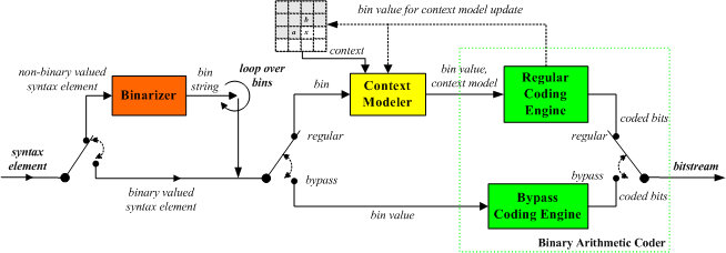 - Arithmetic encoding: An arithmetic coder encodes each bin according to the selected probability model. Note that there are just two sub-ranges for each bin (corresponding to "0" and "1").