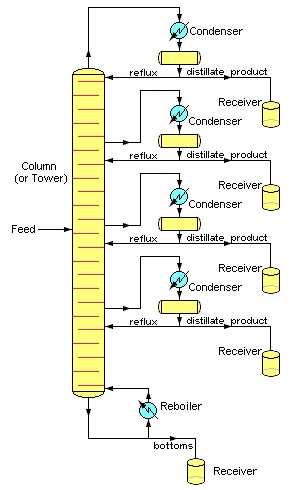 Image 3 depicts a simple continuous fractional distillation tower for separating a feed stream into two fractions, an overhead distillate product and a bottoms product. The "lightest" products (those with the lowest boiling point or highest volatility) exit from the top of the columns and the "heaviest" products (the bottoms, those with the highest boiling point) exit from the bottom of the column. The overhead stream may be cooled and condensed using a water-cooled or air-cooled condenser. The bottoms reboiler may be a steam-heated or hot oil-heated heat exchanger, or even a gas or oil-fired furnace.