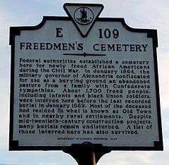 - 1 2 "Office of Historic Alexandria, Alexandria Freedmen's Cemetery: Historical Overview, April 2007, p. 2." (PDF). Archived from the original (PDF) on 2012-03-24. Retrieved 2012-01-29.