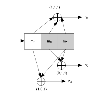 The figure below is a rate 13 (mn) encoder with constraint length (k) of 3. Generator polynomials are G1 = (1,1,1), G2 = (0,1,1), and G3 = (1,0,1). Therefore, output bits are calculated (modulo 2) as follows: