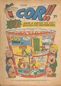 The first Cor!! Featured Gus Gorilla on the front cover, drawn by Mike Lacey. The strip was in the shape of a glass, to promote the free fruit drink that came with it. The comic's most popular strip was Ivor Lott and Tony Broke, a classic tale of two boys – one rich, one poor, with the latter usually the victor of the many battles they had. The strip continued long after the comic closed, finally ending in the last edition of Buster in January 2000.
