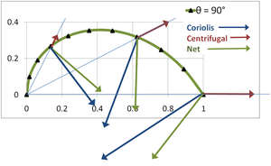 As a result of this analysis an important point appears: all the fictitious accelerations must be included to obtain the correct trajectory. In particular, besides the Coriolis acceleration, the centrifugal force plays an essential role. It is easy to get the impression from verbal discussions of the cannonball problem, which focus on displaying the Coriolis effect particularly, that the Coriolis force is the only factor that must be considered,[27] but that is not so.[28] A turntable for which the Coriolis force is the only factor is the parabolic turntable. A somewhat more complex situation is the idealized example of flight routes over long distances, where the centrifugal force of the path and aeronautical lift are countered by gravitational attraction.[29][30]