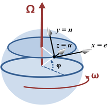 Consider a location with latitude φ on a sphere that is rotating around the north-south axis.[31] A local coordinate system is set up with the x axis horizontally due east, the y axis horizontally due north and the z axis vertically upwards. The rotation vector, velocity of movement and Coriolis acceleration expressed in this local coordinate system (listing components in the order east (e), north (n) and upward (u)) are: