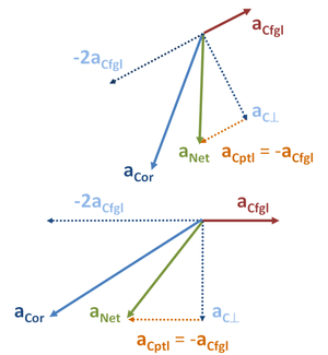It is seen that the Coriolis acceleration not only cancels the centrifugal acceleration, but together they provide a net "centripetal", radially inward component of acceleration (that is, directed toward the center of rotation):[26]