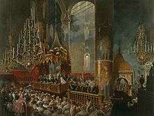 The Emperor now set aside his crown and the Orthodox Divine Liturgy immediately followed. The anointing portion of the ceremony took place during the liturgy, immediately prior to Communion. After the singing of the Communion hymn, the Tsar gave his sword to an attendant and he and the Tsaritsa ascended the Ambo in front of the Royal Doors of the iconostasis, which were thrown open at that moment. There each was anointed with holy chrism by the Patriarch or Metropolitan. The Tsar was anointed on his forehead, eyes, nostrils, mouth, ears, breast and both sides of each hand, then he stepped aside to his right and stood in front of the icon of Christ. His consort then stepped forward and was anointed on her forehead only,[25] then she stepped to her left and stood before the icon of the Theotokos. Each anointing was accompanied by the words, "the seal of the gift of the Holy Spirit."[32] Bells and a second 101-gun salvo ensued. The Metropolitan next escorted the Tsar through the Royal Doors (normally permitted only to deacons, priests or bishops) into the altar, where the Tsar partook of the bread and wine separately, in clerical fashion.[22] This was the only time the Tsar—or any Orthodox layperson—was ever permitted to receive communion in this manner.[17] Unlike the Tsar, the Tsaritsa remained outside the Royal Doors and communicated in standard Orthodox lay fashion, receiving both the bread and the wine together on a spoon.[25]