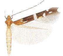 Male, female. Forewing length 3.5 3.7 mm. Head: frons shining greyish white with reddish reflection, vertex and neck tufts shining bronze brown with reddish reflection, laterally lined white, collar shining bronze brown; labial palpus first segment very short, greyish white, second segment three-quarters of the length of third, dark brown with white longitudinal lines laterally and ventrally, third segment white, lined brown laterally, extreme apex white; scape dorsally dark brown with a white anterior line, ventrally white, antenna shining dark brown with a white interrupted line from base to two-fifths, at base a short uninterrupted section, followed towards apex by a dark brown section, two white segments, two dark brown, two white and ten dark brown segments at apex. Thorax and tegulae shining bronze brown with reddish gloss, thorax with a white median line. Legs: shining dark brown, foreleg with a white line on tibia and tarsal segments one and two, segment four with a white apical ring, segment five entirely white, tibia of midleg with white oblique basal and medial lines and a white apical ring, tarsal segments one, two and four with white apical rings, segment five dorsally white, tibia of hindleg with a pale golden metallic basal streak and pale golden metallic medial and subapical rings, and a white apical ring, tarsal segments one to three with white apical rings, segment four and five entirely white, spurs dark brown, apically lighter. Forewing with basal one-fifth shining bronze brown with reddish gloss, remaining part shining dark brown with reddish gloss, at one-fifth three short silver metallic streaks with bluish reflection, a subcostal, a medial just above fold and more towards base than the subcostal, a subdorsal, further from base and twice as long as the subcostal and the medial, a broad tubercular silver metallic fascia with violet reflection in the middle, perpendicular on dorsum, at three-fifths a tubercular silver metallic dorsal spot with violet reflection, a similarly coloured but much smaller costal spot at three-quarters, outwardly edged by a narrow white costal streak, between the fascia and the dorsal spot a yellow streak at dorsum, apical line as a short silver metallic streak with bluish reflection in the middle of the apical area and a broad white spot in cilia at apex, cilia dark brown, paler on dorsum towards base. Hindwing shining brownish grey, cilia brown. Underside: forewing shining dark greyish brown with the white costal streak and apical spot distinctly visible, hindwing greyish brown. Abdomen dorsally shining pale ochreous-brown with reddish gloss, laterally darker, segments two to seven banded light grey posteriorly, ventrally dark greyish brown, segments broadly banded shining white posteriorly and with a shining white longitudinal medial streak, anal tuft greyish brown.[1]