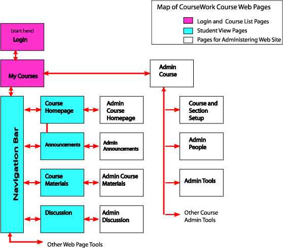 CourseWork had two basic views: student and instructor for each page that the student viewed. The instructor also viewed a set of links to editing wizards that stepped them through the development process. Each user logged on to CourseWork and then viewed a list of the courses in which they were registered. From this page they could navigate to one of their course sites. A course site, from the user point of view, consisted of a set of tools: