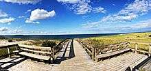 Crane Beach is a 1,234-acre (4.99 km2) conservation and recreation property located in Ipswich, Massachusetts, immediately north of Cape Ann. It consists of a four-mile-long (6 km) sandy beachfront, dunes, and a maritime pitch pine forest. Five and a half miles of hiking trails through the dunes and forest are accessible from the beachfront.