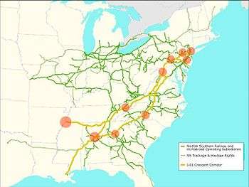 The Crescent Corridor is a railroad corridor operated by the Norfolk Southern Railway (NS). The project, first proposed in 2007, and scheduled for completion by 2020, spans 13 states from New York to Louisiana.[1][2] It is a private-public partnership between Norfolk Southern and the various state and federal governments.[2]