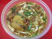 - Katong Laksa, a Singaporean thick rice noodles (bee hoon) in a coconut curry gravy with prawn and egg. Sometimes chicken, tau pok (beancurd puffs) or fish cake may be added.
