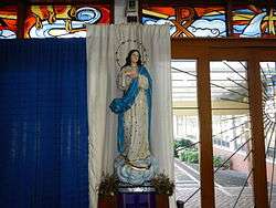 The Ateneo has adopted blue and white, the colors of Mary, as its official school colors. Marian blue is traditionally ultramarine, a deep ocean blue tincture derived from lapis lazuli, which historically has been used to color the vestments of Mary in paintings. But since Mary is honored as Stella Maris (Star of the Sea) and Queen of Heaven, various shades of blue, such as royal blue and sky blue, are acceptable shades of Marian blue as well.