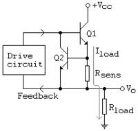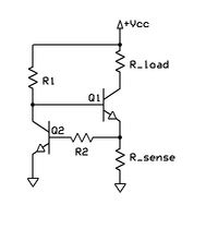 The circuits at right and left operate more efficiently from a single (Vcc) supply. In both circuits, R1 allows Q1 to turn on and pass voltage and current to the load. When the current through R_sense exceeds the design limit, Q2 begins to turn on, which in turn begins to turn off Q1, thus limiting the load current. The optional component R2 protects Q2 in the event of a short-circuited load. When Vcc is at least a few volts, a MOSFET can be used for Q1 for lower dropout voltage. Due to its simplicity, this circuit is sometimes used as a current source for high-power LEDs.[1]